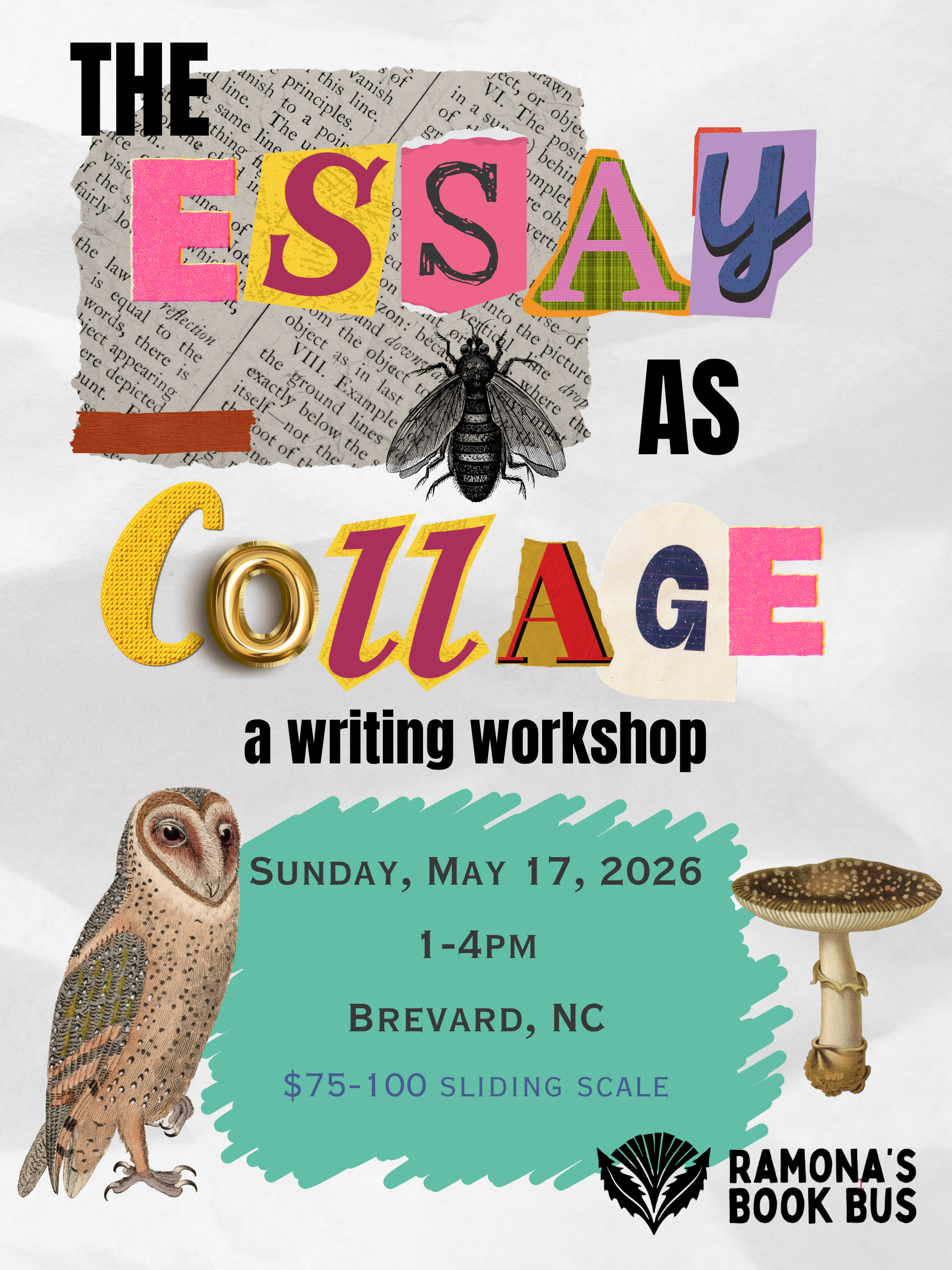 This 1-day generative writing workshop will meet in person at Ramona’s Book Bus (downtown Brevard, NC). We’ll read together, generate new writing through a series of prompts and exercises, and share with one another. There will also be glue sticks, scissors, and collaging materials to help us (re)imagine possibility and form. Come ready to write, play, and wonder.